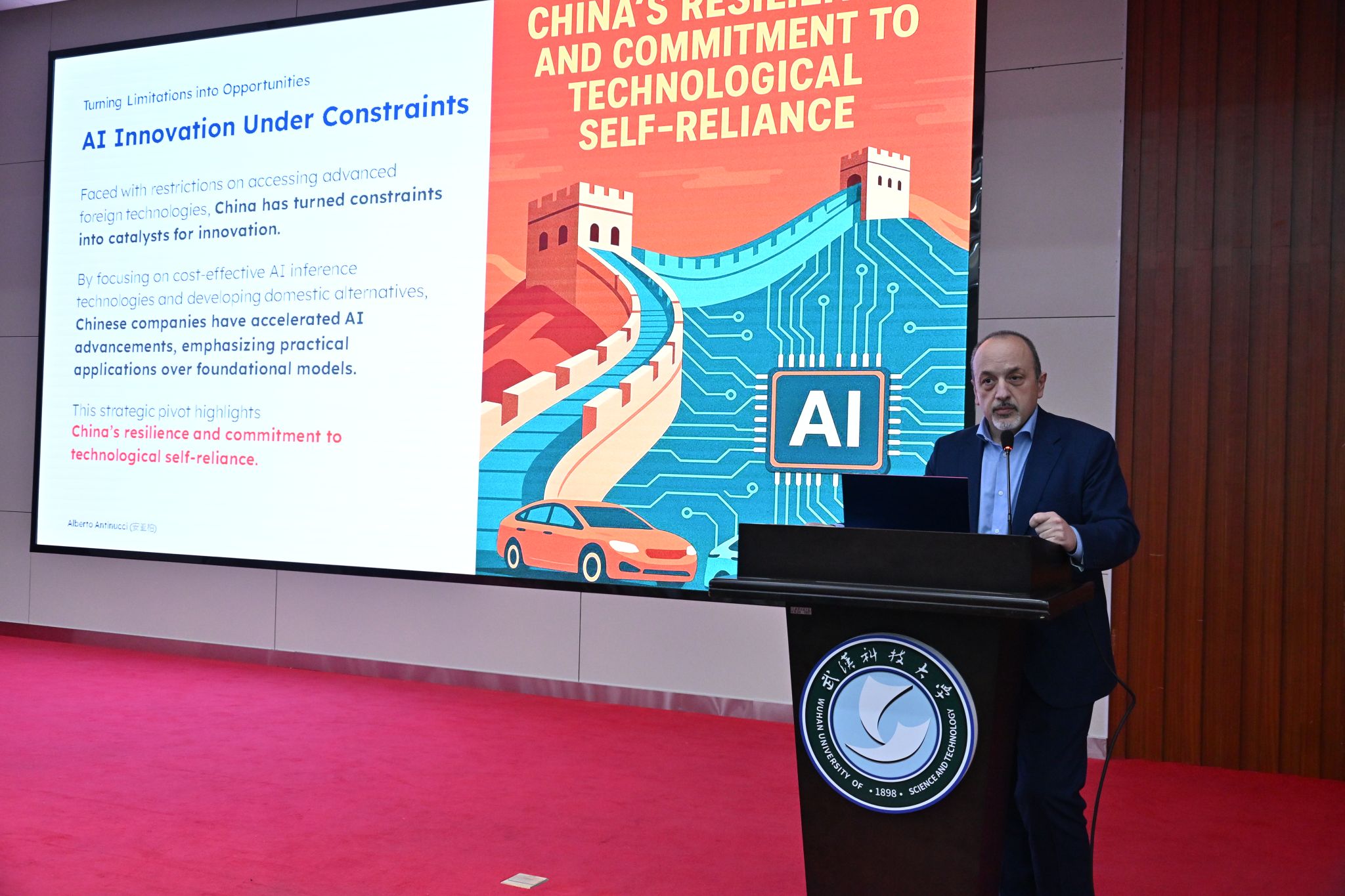 Alberto Antinucci(安亚柏),英国奇切斯特大学@H-Farm学院教授、武汉科技大学特聘教授,意大利资深企业家、学者及商业战略顾问,在中国拥有超过三十年职业与创业经验。现任意大利H-FARM学院教授、意大利中国友好关系协会副主席,长期致力于推动中欧在人工智能、跨境电商与创新创业领域的合作交流,深耕中西方创新合作范式构建。他创办并成功推出多家科技公司,任教于中欧多所高校,主讲“人工智能应用”“中国商业战略”等课程,帮助创业者和企业高管理解中国市场运作与跨文化商业模式;精通中国市场运作,高度关注中国电商直播、人工智能应用等创新模式,积极推动“一带一路”地方合作委员会与意大利城市间的合作,助力中意在经贸、文化、教育等领域的深度联动。近年来,其积极参与中大型企业人工智能解决方案研发,始终强调学术研究与实务操作的深度融合,相关讲座与分享深受中外学生与业界人士欢迎。